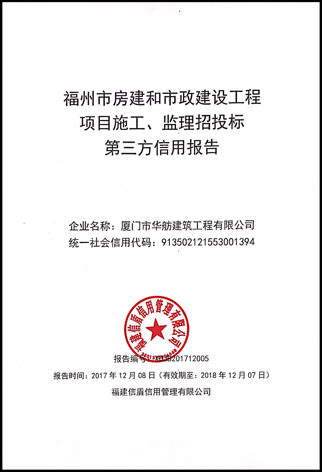 廈門市華舫建筑工程有限公司 XDJB201712005