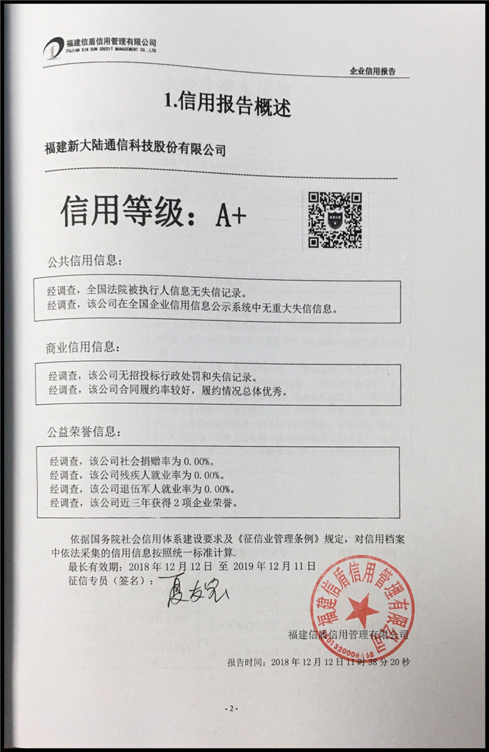 福建新大陸通信科技股份有限公司 XDBG201812112